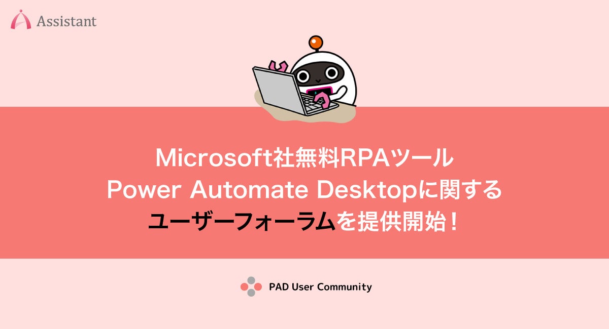 Power Automate Desktopを中心とした RPA領域の導入コンサルティングサービスを展開する株式会社アシスタント(東京都千代田区、代表取締役:合原恵)は、Microsoft社無料RPAツールPower Automate Desktop(PAD) に関するユーザーフォーラム「PAD User Community」を開設致しました。