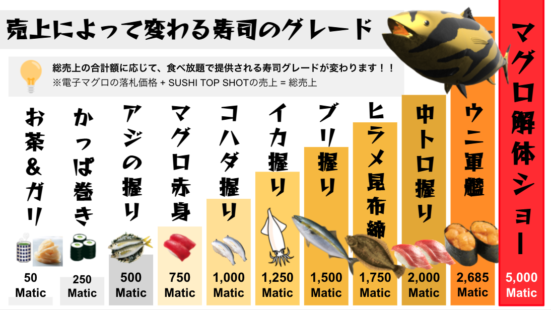 変更前 ⇒ 電子マグロとSUSHI TOP SHOT 7種の売上に応じて食べ放題になる寿司のグレードがアップするイベントが3日よりスタート