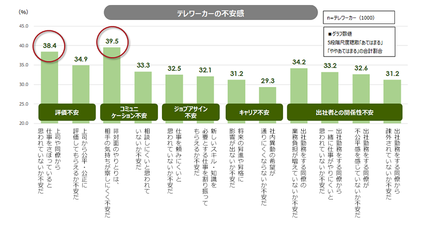 パーソル総合研究所の調査*によると、テレワーカー本人が感じている不安で最も高い割合となっているのは、「コミュニケーションに関する不安」であり、4割近い人が不安を感じております。