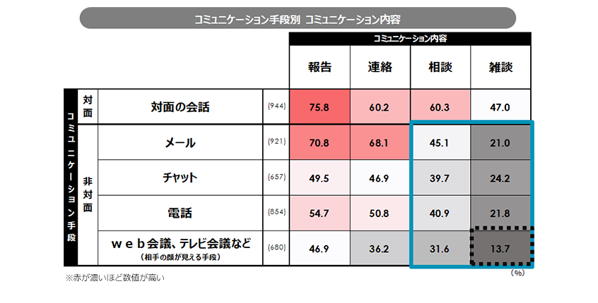 また、上司とのコミュニケーションについて、リアルな場で顔を合わせる「対面」の場合と、リアルな場で顔を合わせない「非対面」の場合を比べると、「非対面」の方が「報告」「連絡」「相談」「雑談」のすべてが行われない傾向にあります。したがって「非対面」は上司との距離が生まれやすい環境となります。