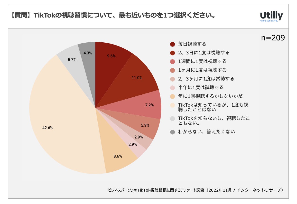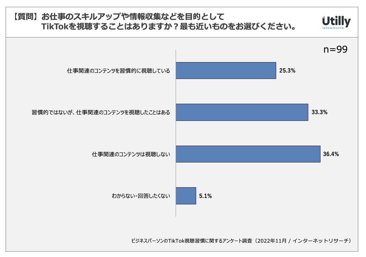 BtoBサービスの比較メディアUtilly(運営会社:株式会社GO TO MARKET、所在地:東京都渋谷区)では、2022年11月にビジネスパーソンのTikTok視聴習慣に関するアンケート調査を実施しました。