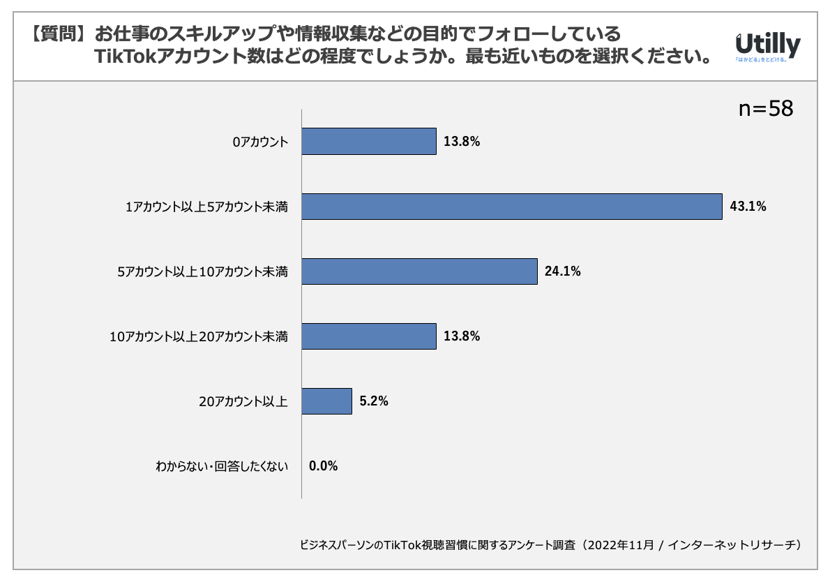【質問】お仕事のスキルアップや情報収集などの目的でフォローしているTikTokアカウント数はどの程度でしょうか。最も近いものを選択ください。