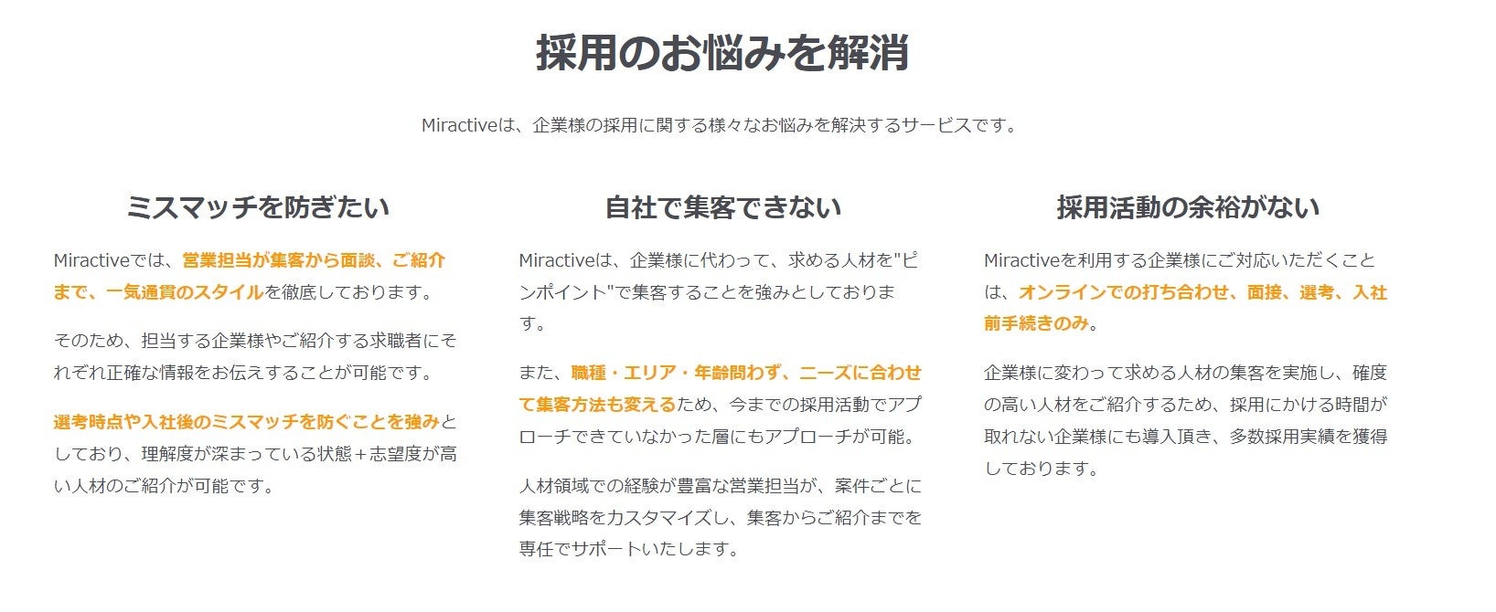 ▲人材紹介サービス「Miractive」法人向けサービス提供ページ