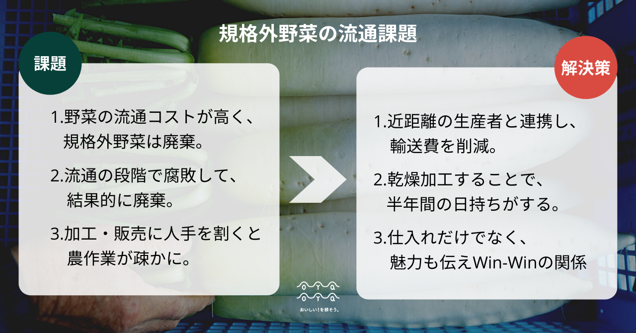OYAOYA創業のきっかけとなった、農家さんの元を訪れた際には、「規格外野菜を買い取ってくれるのは嬉しい。しかし過去に安くで買い叩かれた経験がある。だから、規格外野菜を使った事業をするなら、生産者とはWin-Winの関係を築いてほしい。」このことをきっかけにOYAOYAを創業し、規格外野菜であっても味と生産者の魅力で評価して適正価格で買い取りを行なっています。