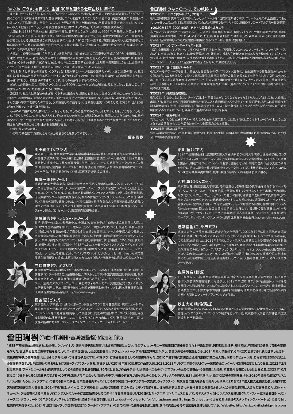 一見、會田瑞樹の活動する分野 ”現代音楽” とは異なる趣と捉えられがちですが、會田瑞樹は大正時代と令和時代の、多様性への志向に類似点があることを常々感じてきました。江戸時代の文化から西洋化を推し進めた明治時代を経て、変化に対する疲弊が社会全体を仄暗く包み込みながらも、様々な文化やイデオロギーが混在する大正時代に生み出されたまざあ・ぐうすの世界は、富めるものも貧しきものも、健やかなるものも病めるものも、時に優しく、時に厳しく、人々を見守り勇気付けてきました。21世紀の多様性への新たな表現として、この音楽の先駆性を多くのお客様と共に分かち合いたく意気込んでいます。