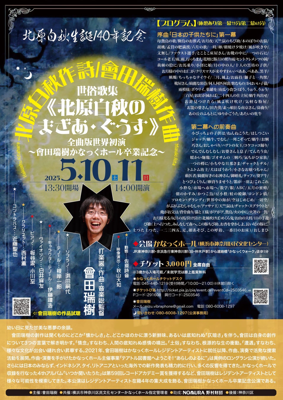 5月10/11日、かなっくホールにおいて朝日新聞文化財団、野村財団からの助成を得て開催される、會田瑞樹作曲 世俗歌集《北原白秋のまざあ・ぐうす》は4時間に渡る超大作。