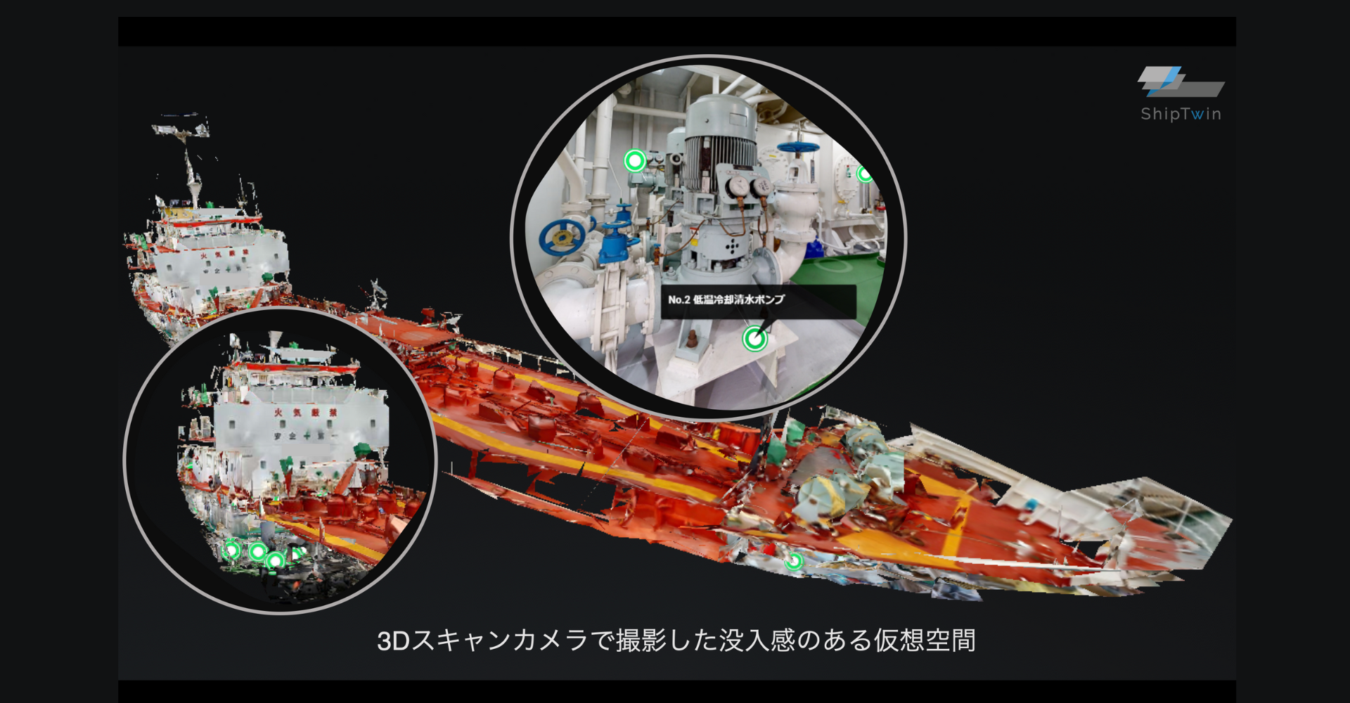 ShipTwinは、ArchiTwinのプラットフォームをベースとし、3Dスキャンカメラで撮影した、正確で没⼊感のある仮想空間を表現します。複雑な構造である船内を、区画ごとに表⽰・管理が可能です。また、仮想空間内の機器にタグ付けし、名称を登録できるほか、タグに対するチャット機能を設けており、機器や周囲の状況を船上と陸上で共有しながら情報のやり取りが可能です。