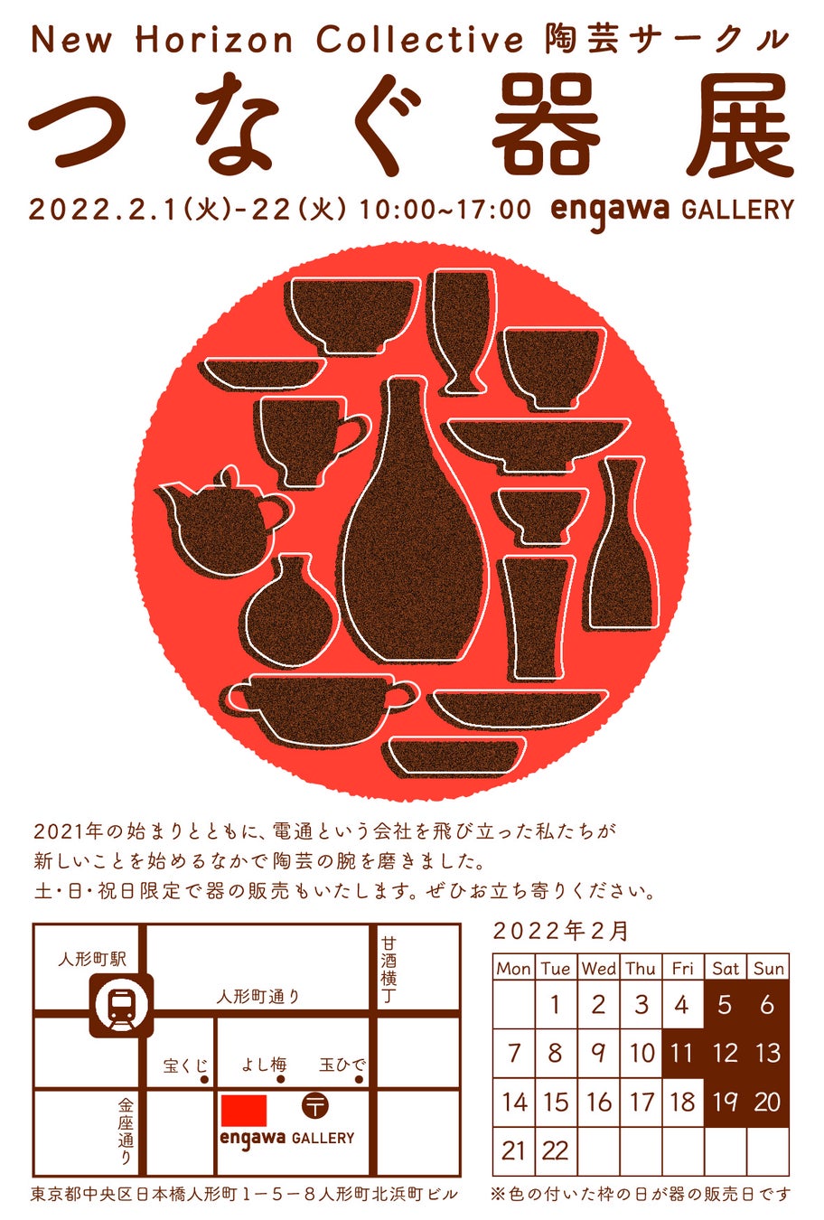 株式会社電通グループ40代、50代のミドル世代のプロフェッショナル人材約230名が集まり、人生100年時代の新しい働き方を提案するニューホライズンコレクティブ合同会社 (以下NH 東京都中央区、代表:山口裕二・野澤友宏)は、2022年2月1日(火)より人形町の共創イノベーションスペース「ニューホライズンパーク」に併設される人形町engawa GALLERYにて「つなぐ器展」を開催いたします。
