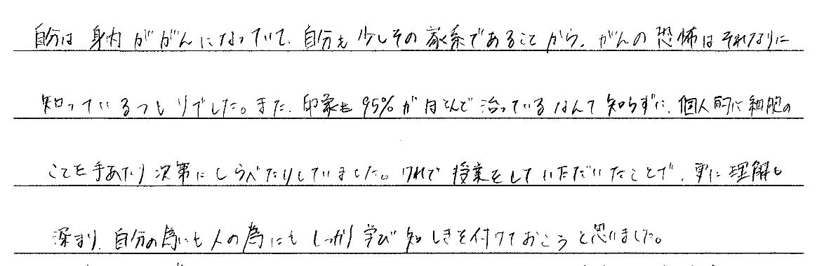 「がんになった人に対する、接し方を教えてもらえてよかった。いつか家族や友達がなるかもしれないので、不安にさせないように気をつけていきたいです」