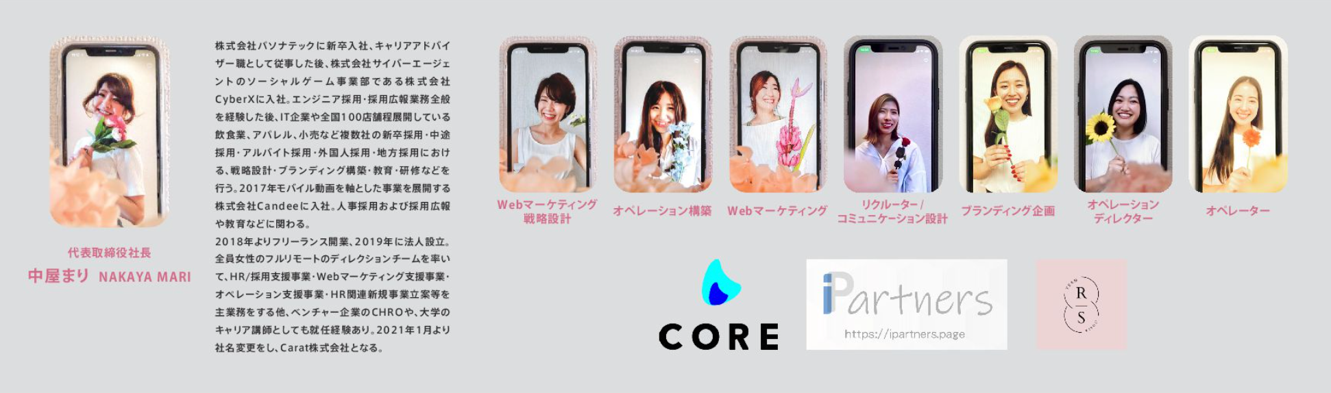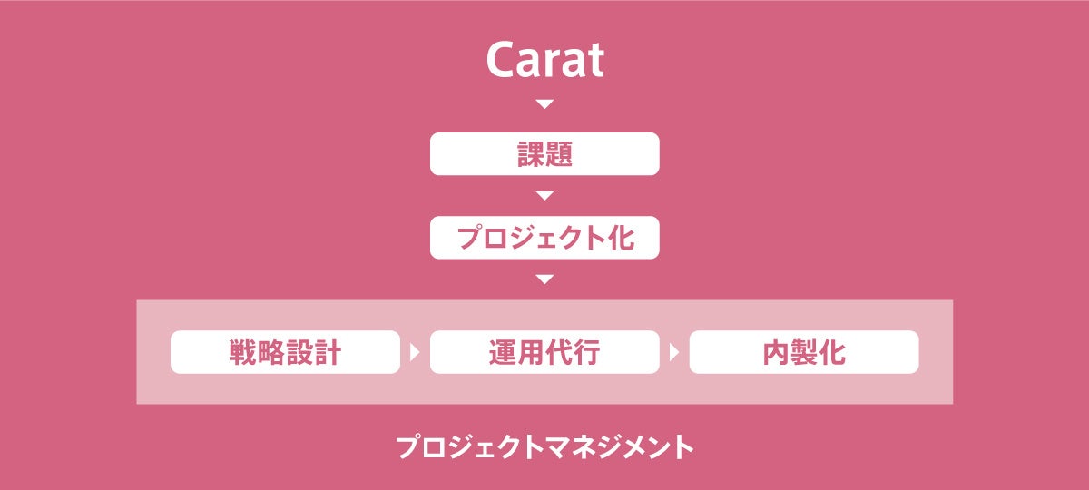 Caratは、全員が女性、全員がフルリモートワークのプロジェクトマネジメントに特化した専門集団です。オーダーメイド型かつ貴社のメンバーの一員として入り込むハンズオン体制にて進行することを強みとしています