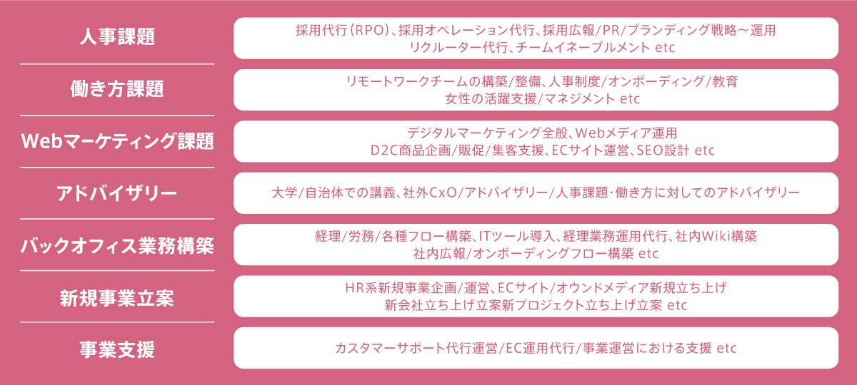 事業内容:採用代行・支援事業・人事関連事業・Webマーケティング事業・カスタマーサポート代行事業、その他付帯する事業