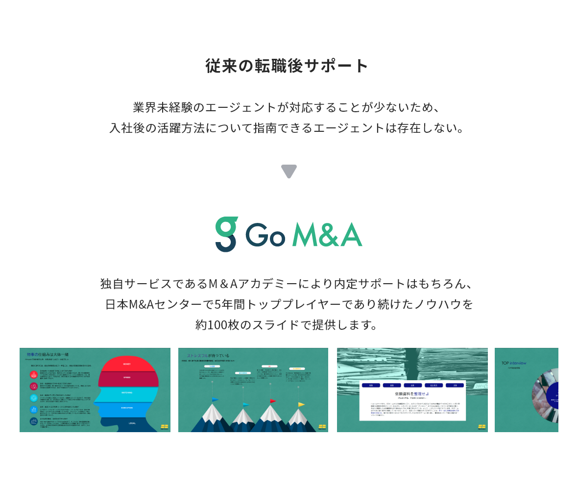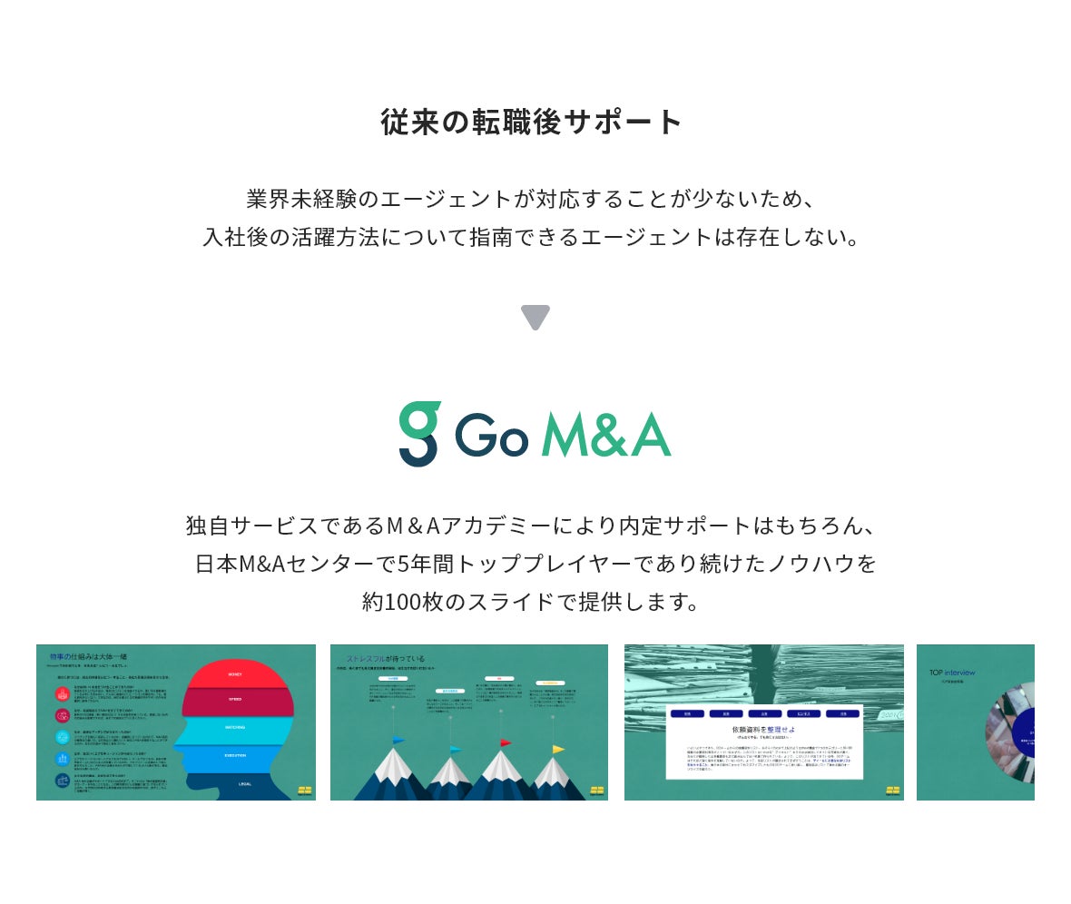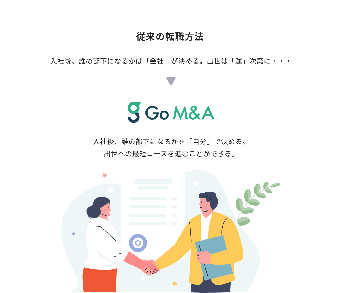 「組織に所属しているなら、目の前の上司が未来でしょ。」をコンセプトに、転職先の花形部署のエースプレーヤーが指揮する部署に配属が確約された、M&A業界に特化した転職支援サービスです。