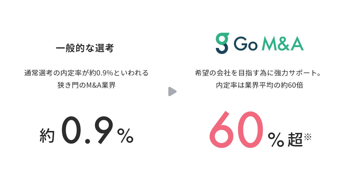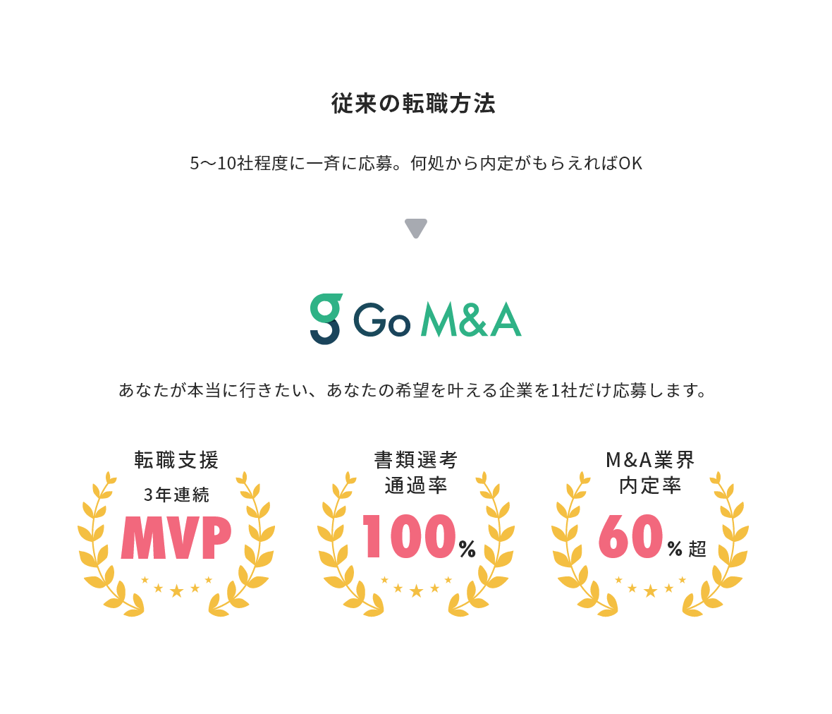 転職活動は“誰にお願いするか”内定を獲得できる確率が天と地ほど変わります。M&A企業の人事責任者、事業責任者と日頃から時間を共にしている「Go M&A」だからこそ、求職者と企業のマッチングの最適解を導き出せます。