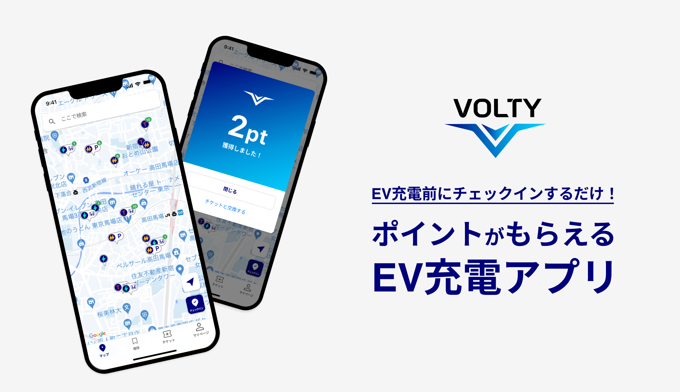 2023年9月に事前登録を開始し1ヶ月で約500ユーザーのご登録をいただいた「Volty App」を本日提供開始いたしました。EV充電器付近でチェックインをするとポイントを貯める機能を搭載しております。
