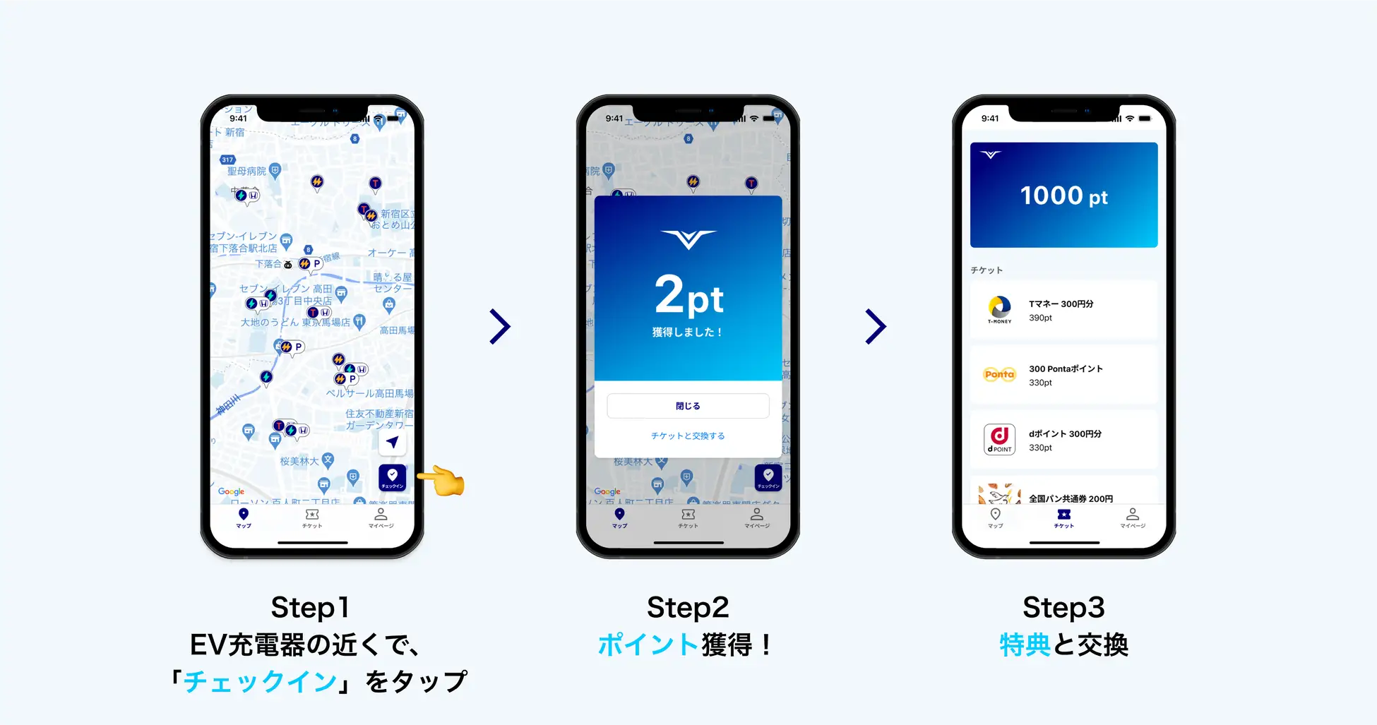 EV充電器を利用する度に「チェックイン」するだけで、ポイントが獲得できる機能を先行して提供するために、以下の機能はまだ提供できておりませんが、近日中のリリースを予定しております。