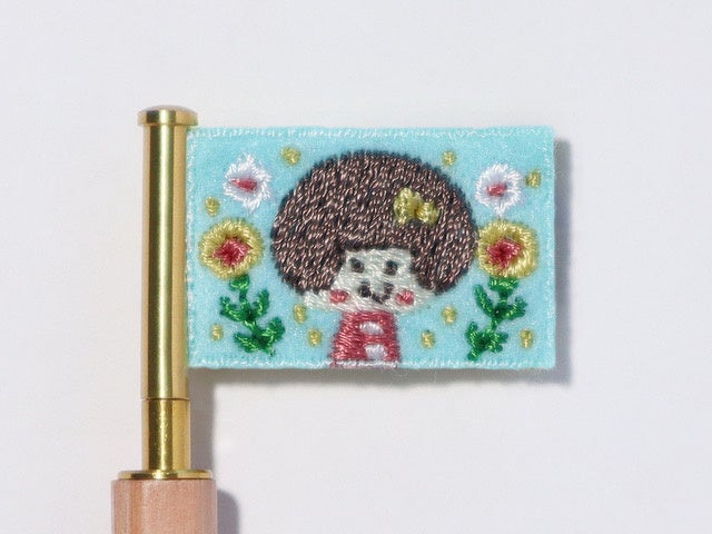 mizutamaさんおなじみのおかっぱ頭の女の子を主役にしたフラッグは、原画のやわらかいタッチとキュートな表情をそのまま刺繍で表現。さわやかなブルーの背景に映えるリボンと同じ黄色のひまわりが、女の子をキラキラと輝かせています。mizutamaさんらしい、明るくポップなデザインです。