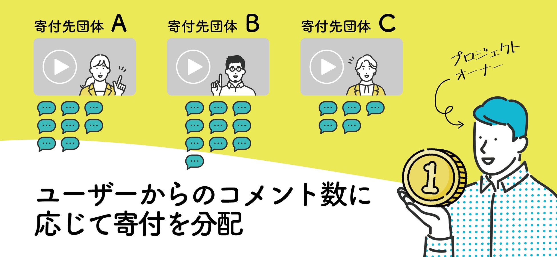 プロジェクト実施期間終了後には、プロジェクトに参加したそれぞれの寄付先団体に対して、ユーザーからの応援コメント数の割合に応じて寄付総額を按分した額が、プロジェクトオーナーより送られます。
