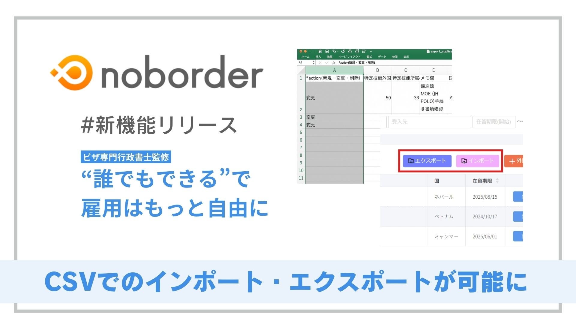 特定技能申請管理ツール「noborder」、CSVインポート・エクスポート機能を提供開始