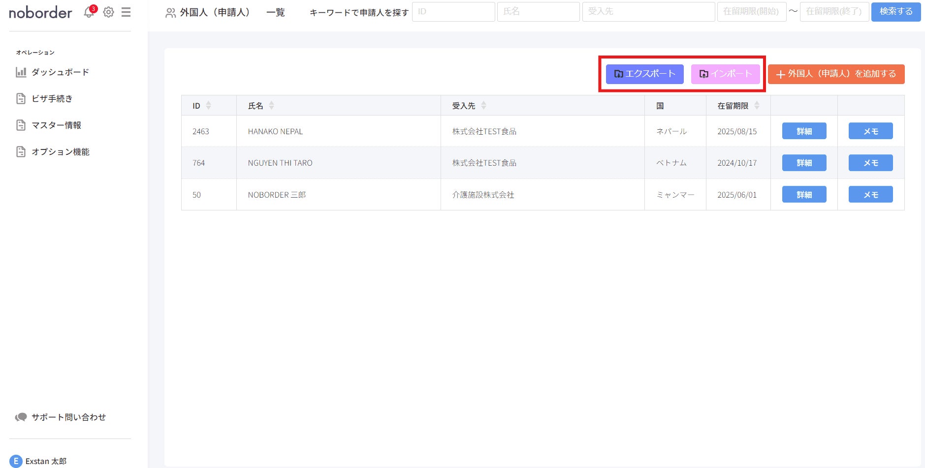 特定技能申請管理ツール「noborder」を提供するExstan株式会社(本社:東京都世田谷区、代表取締役:辰航也)は、新機能として外国人情報のCSVインポート・エクスポート機能を2024年7月12日に提供開始します。