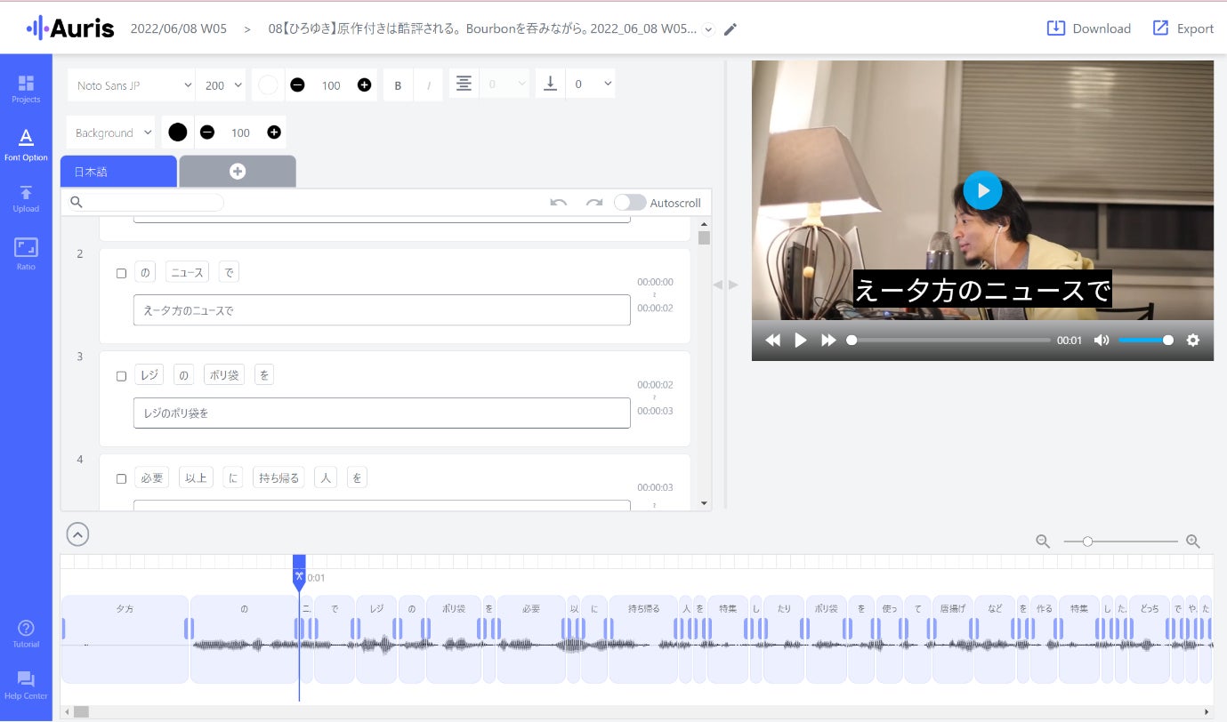 Aurisは、AI×人によるテキスト化と翻訳で、動画価値を最大化するサービスです。現在、日本語、英語、中国語 の他、東南アジアを中心とした20言語の文字起こし、および翻訳が可能です。