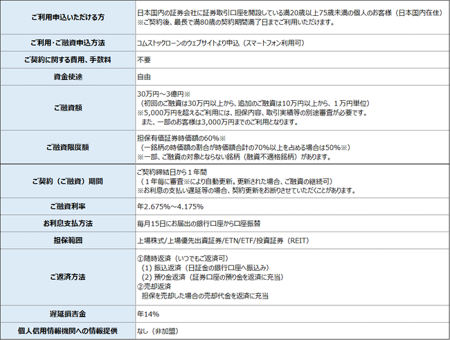 ・SBI証券、SMBC日興証券、三菱UFJモルガン・スタンレー証券、野村證券の大手証券会社4社と提携しており、いずれかの証券総合口座を開設されているお客様は、当該口座で保有されている上場株式等を担保にコムストックローンをご利用いただけます。(各提携サービス)