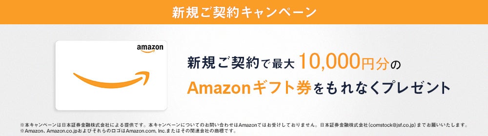日本証券金融株式会社(本社:東京都中央区、代表執行役社長:櫛󠄁田 誠希、以下「日証金」)は、個人投資家向けのオンライン型証券担保ローンサービス「コムストックローン」にて「新規ご契約キャンペーン」を実施します。Amazonギフト券がもれなくもらえるお得なキャンペーンですので、ぜひ、この機会に資金使途自由でスピーディーに資金調達ができる「コムストックローン」のご利用をご検討ください。