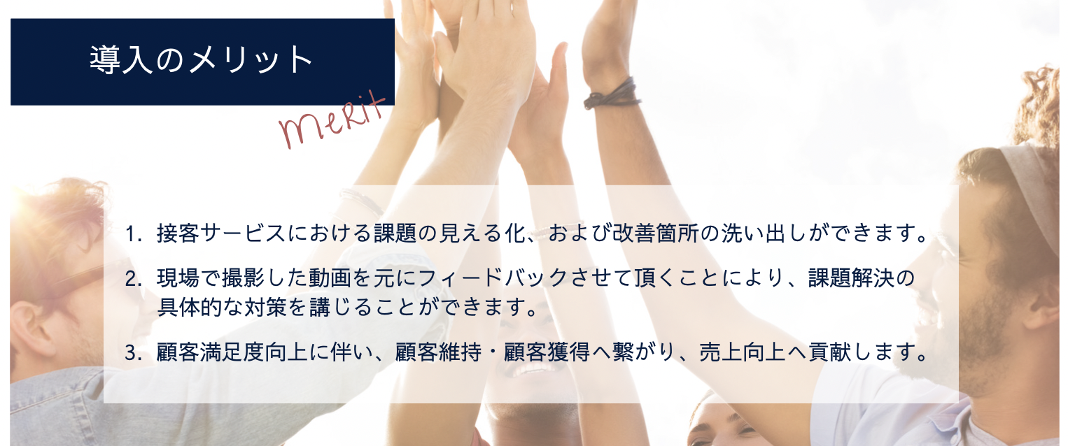 接客担当者(被写体となる方)及び、現場管理者、経営者の皆さんにとって、客観的に現場の様子を動画で切り抜くことができ、現場の現状を正確に把握することができます。その後の施策の立案へ役立てることができます。