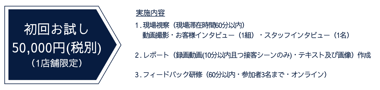 店舗視察(動画撮影を含む)によるサービス現場の課題調査を行い、その調査レポートを元に改善箇所について共有させて頂きます。サービス現場の現状を社内共有し、課題を浮き彫りにすることで、今後の実施施策の策定に役立てます。