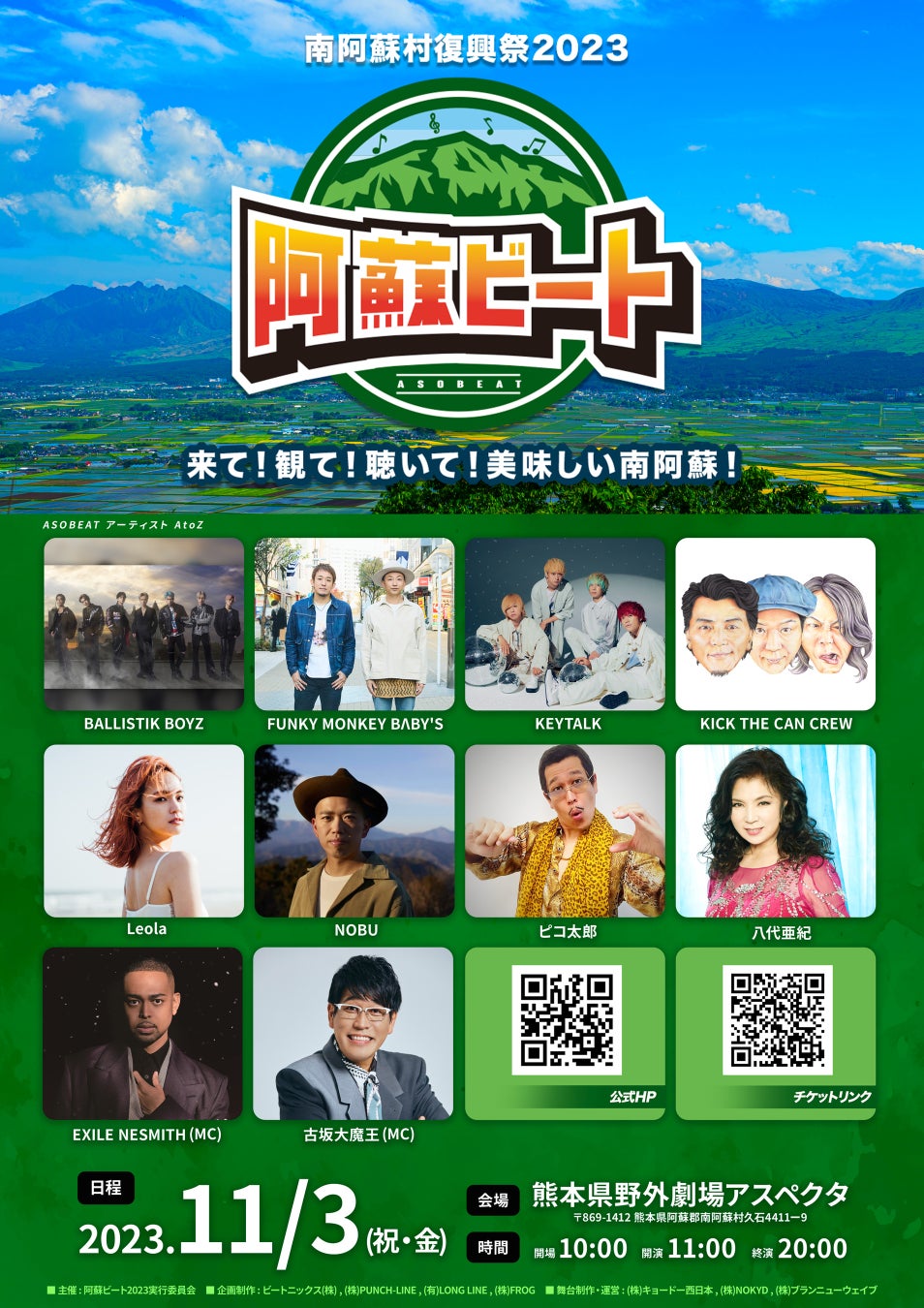 南阿蘇の新たな野外フェスイベント「阿蘇ビート2023」へ、BALLISTIK BOYZ、FUNKY MONKEY BΛBY'S、KICK THE CAN CREW、NOBUの参戦が決定しました!