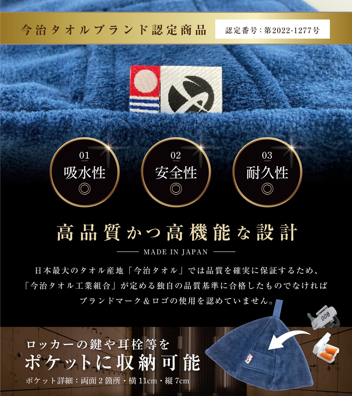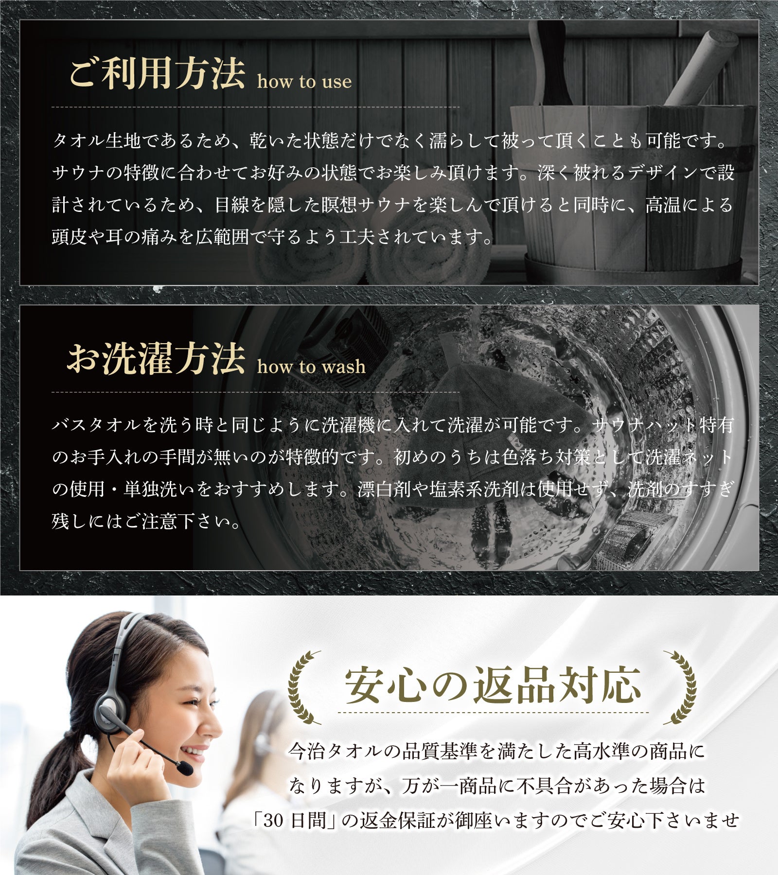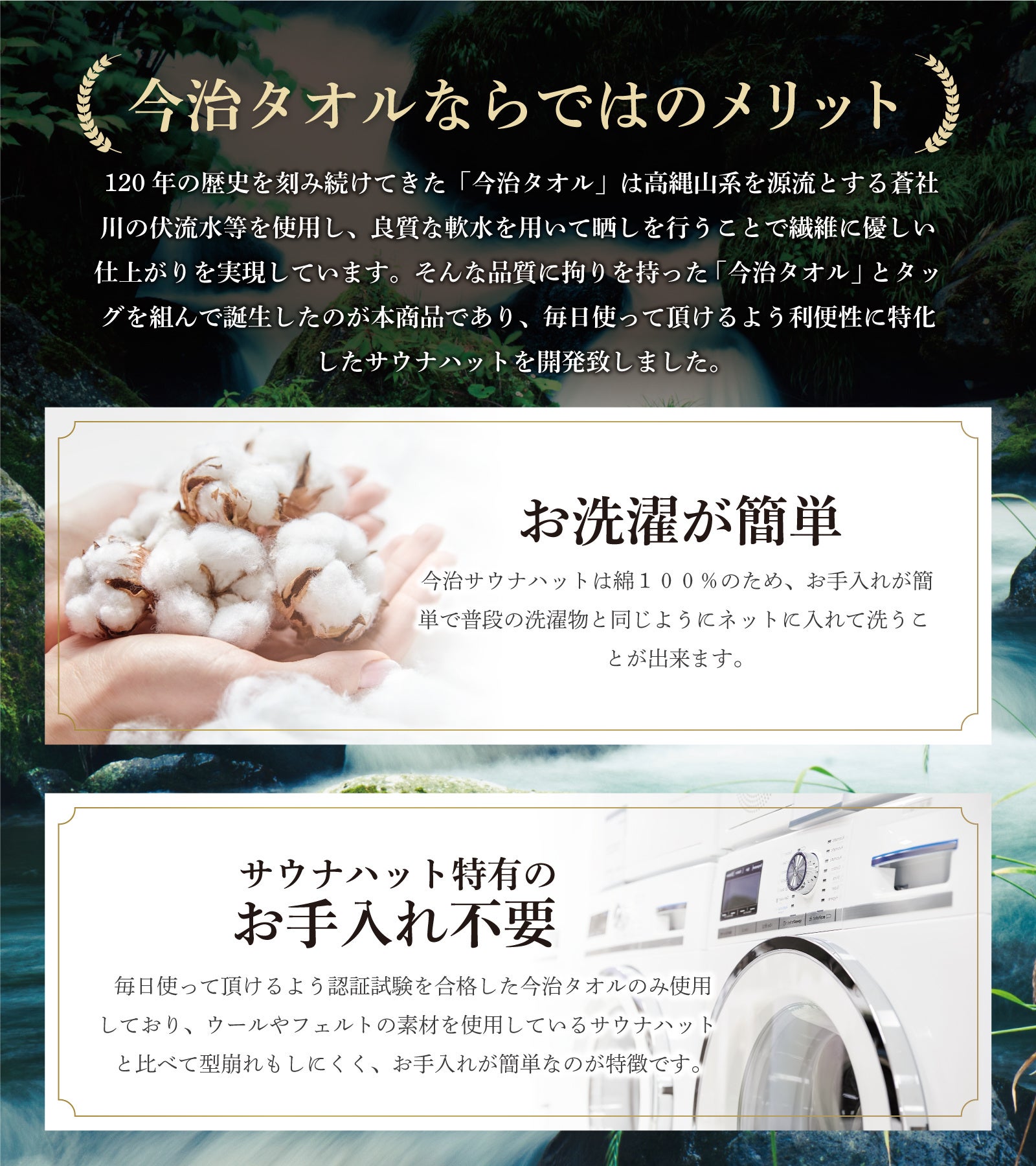 「今治タオル」を使用したサウナハットなので、サウナハット特有の手間がなく、普段のバスタオルと同様にお洗濯して頂くことが可能です。