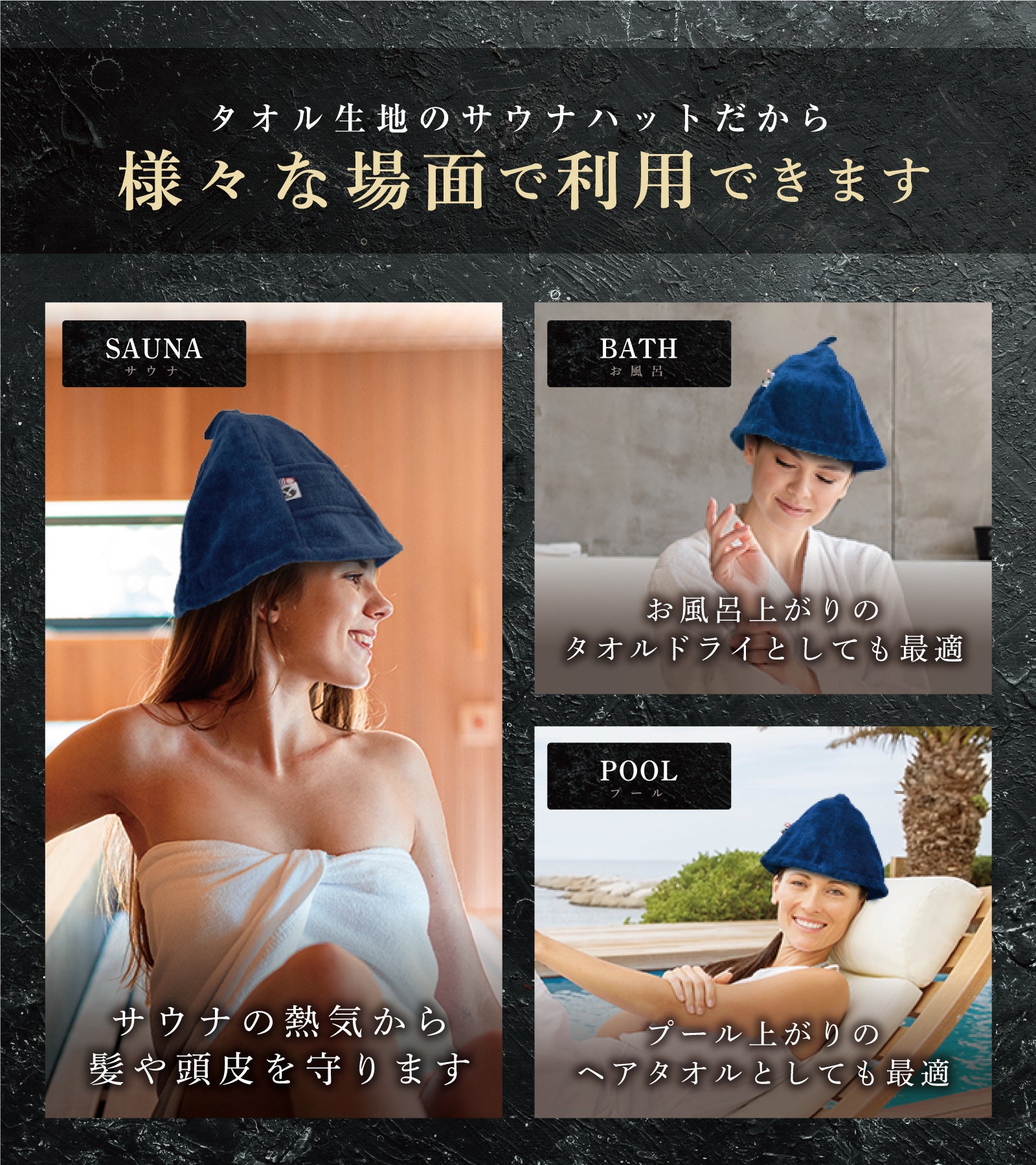 「タオル生地」の特性を活かし、サウナに行かない日でも「お風呂上がり」のタオルドライ等、2WAY・3WAYの使い方を可能にしています。