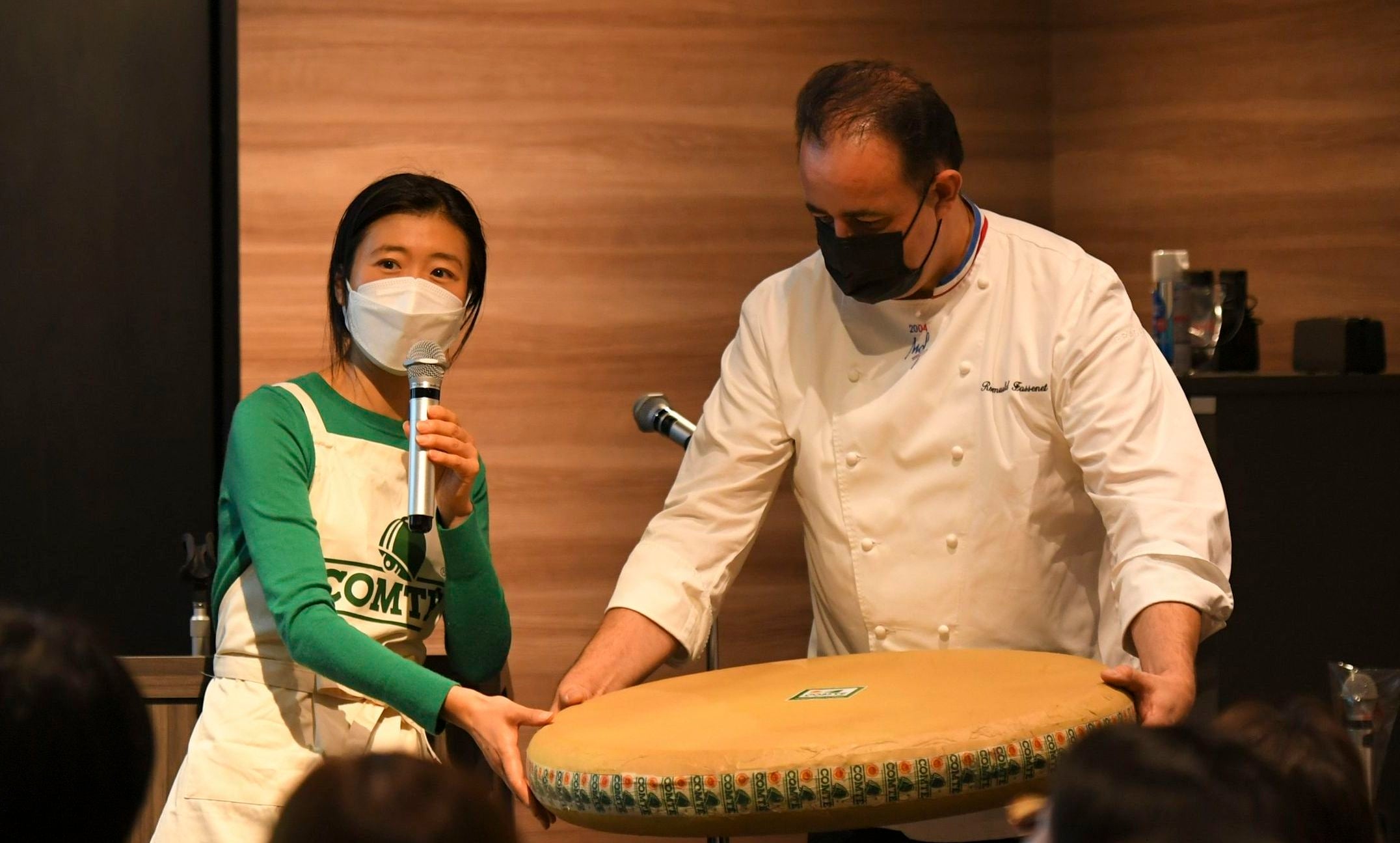 コンテのアンバサダーも務めるMOF(国家最優秀職人章)受賞シェフのロミュアルド・ファスネ氏も来日し、直径60㎝、高さ10㎝、実際は約40㎏の重さの原寸大模型を持って、コンテの魅力や、また昨年移転リニューアルオープンしたコンテのことが包括的に学べるコンテ博物館をアピールしました。