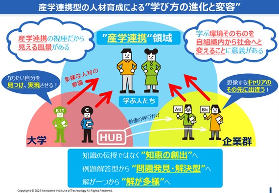 金沢工業大学では、「イノベーションは異なるものの結びつきによって生まれる」という考えから、「世代・分野・文化を超えた共創教育」を全学的に進めています。特に社会人が在学生と共に教育プログラムに参画する「世代を超えた共創教育」は、学生の多くが高校卒業後に進学した同一世代であることに変化をもたらし、学ぶ環境そのものを変革させます。これにより、得られる知見の質を高める意義があります。