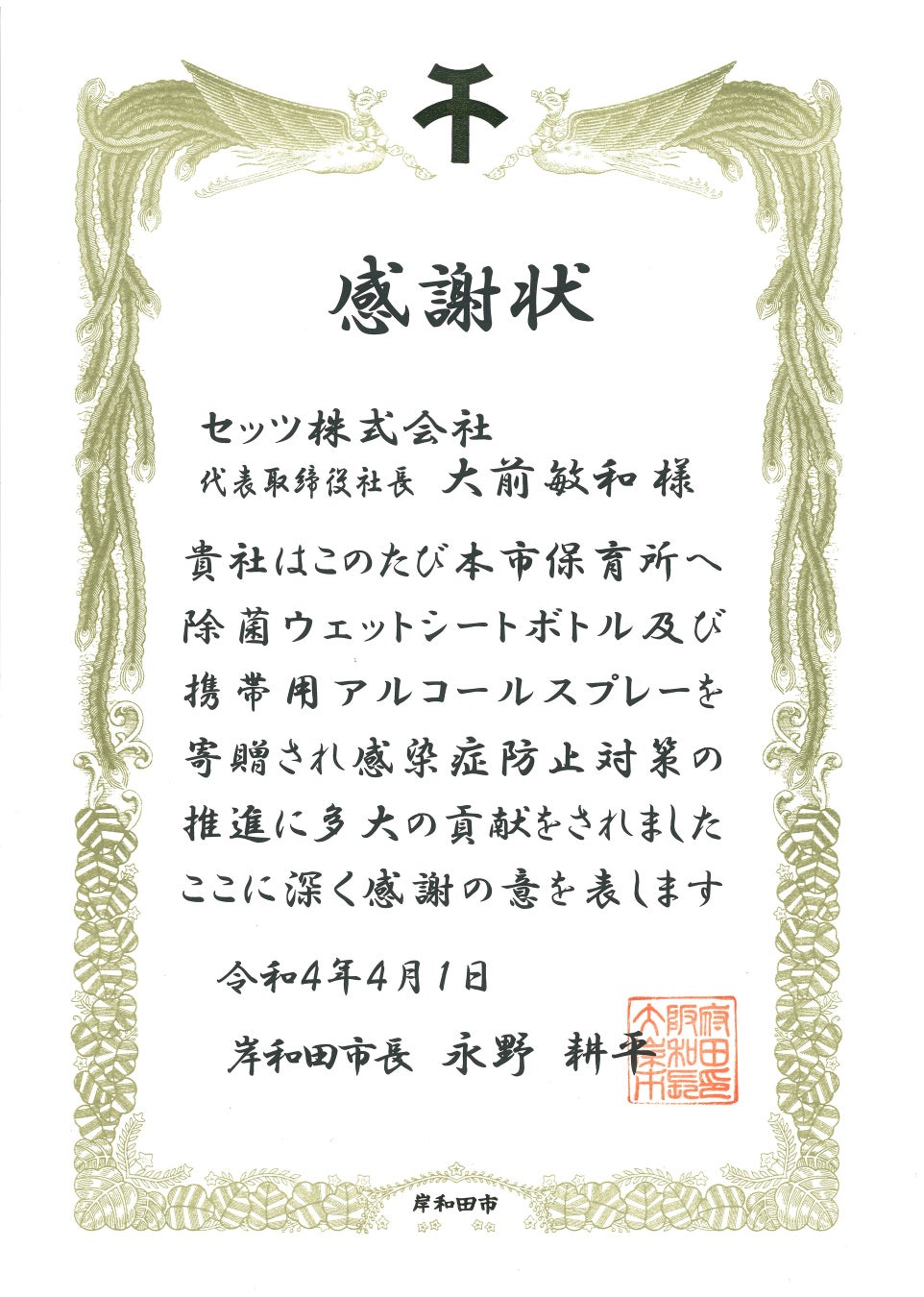 セッツ株式会社発祥の地であり、成長の舞台となった大阪市、および現在本社を置く堺市への寄贈をはじめ、近隣地域へウイルス感染防止に少しでもお役に立てるものづくり集団でありたいという考えのもとに、今回ご縁をいただいた岸和田市へ寄贈するに至りました。