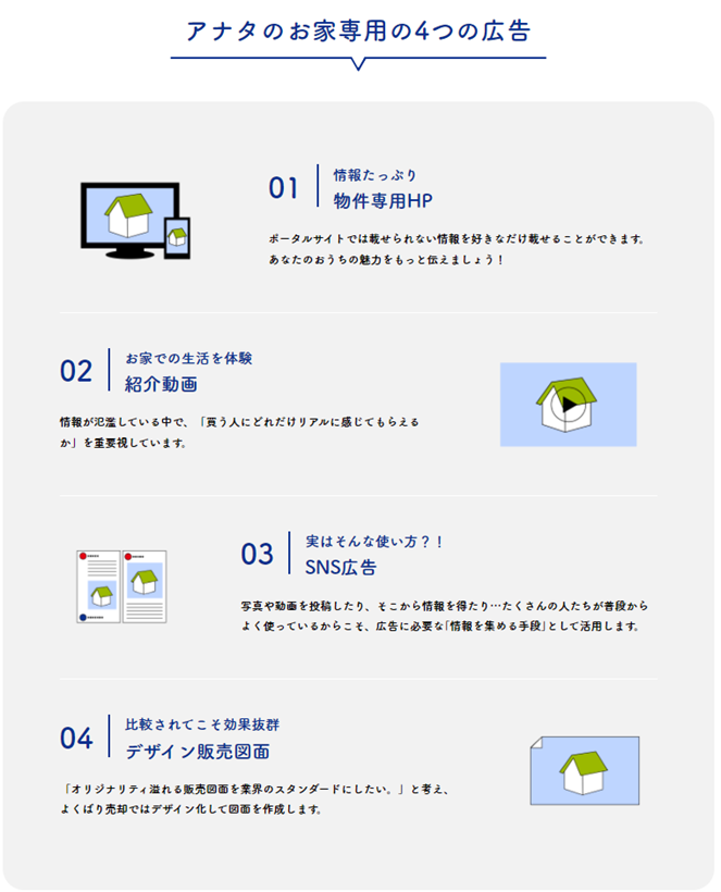 ①の「広告」では、物件の販売のためよくばり売却がどのような広告活動を行うのかをご紹介。4つの手段を用いて、お家の魅力を幅広くお届けします。