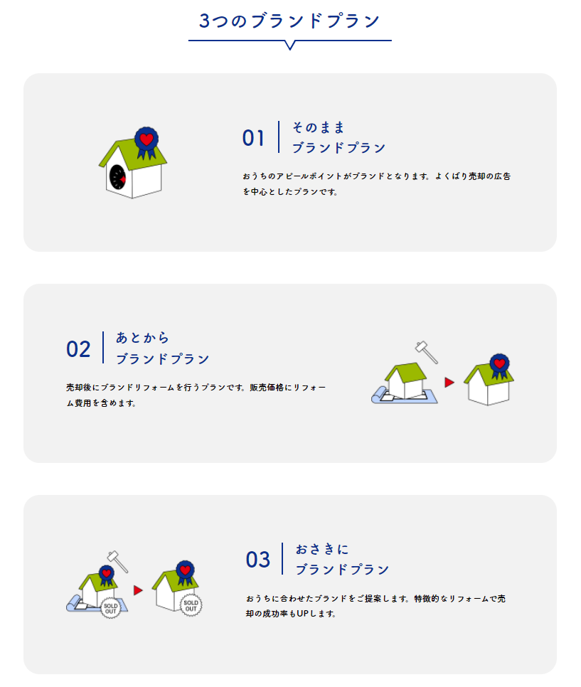 ①そのままブランドプラン では、おうちが持つ特徴を最大限に活かすブランド考案と展開を行います。