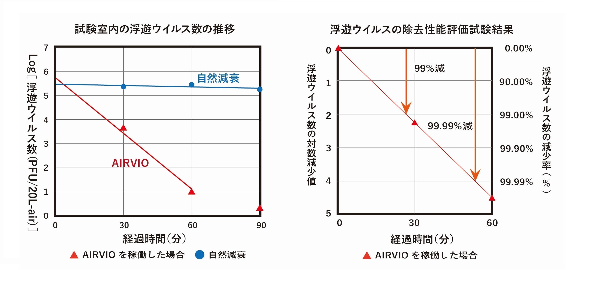 ウイルスの除去性能評価試験においてAIRVIO稼働後27分で99%、54分で99.99%ウイルスの減少を確認