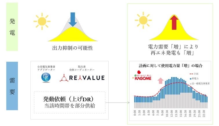 カゴメ株式会社(代表取締役社長:山口聡、本店:愛知県名古屋市中区錦3丁目14番15号、以下「カゴメ」)、Reivalue株式会社(代表取締役:堀口公希、本社:東京都港区浜松町、以下「リアイバリュー」)、株式会社グローバルエンジニアリング(代表取締役:高橋宏忠、本社:福岡県福岡市東区香椎、以下「グローバルエンジニアリング」)は、埋没する再生可能エネルギー(以下「再エネ」という)の利活用のため、部分供給※1を活用した電力需要を創出する上げDR※2の実証を行うことに合意しました。