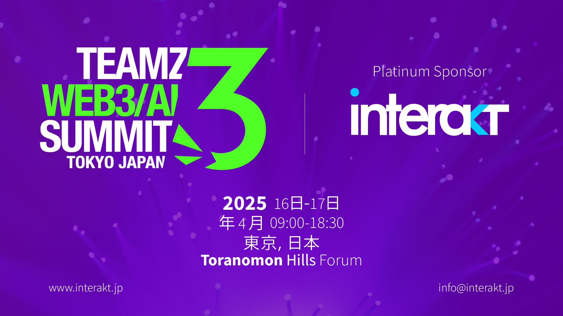 TEAMZ Web3/AI Summit 2025 は、Web3やAI業界を代表するリーダー、投資家、イノベーターが集結する国際規模のイベントで、分散型テクノロジーの未来を共に創造する場です。Interaktは、この機会を活かして最先端の技術を紹介するとともに、業界の発展に貢献してまいります。