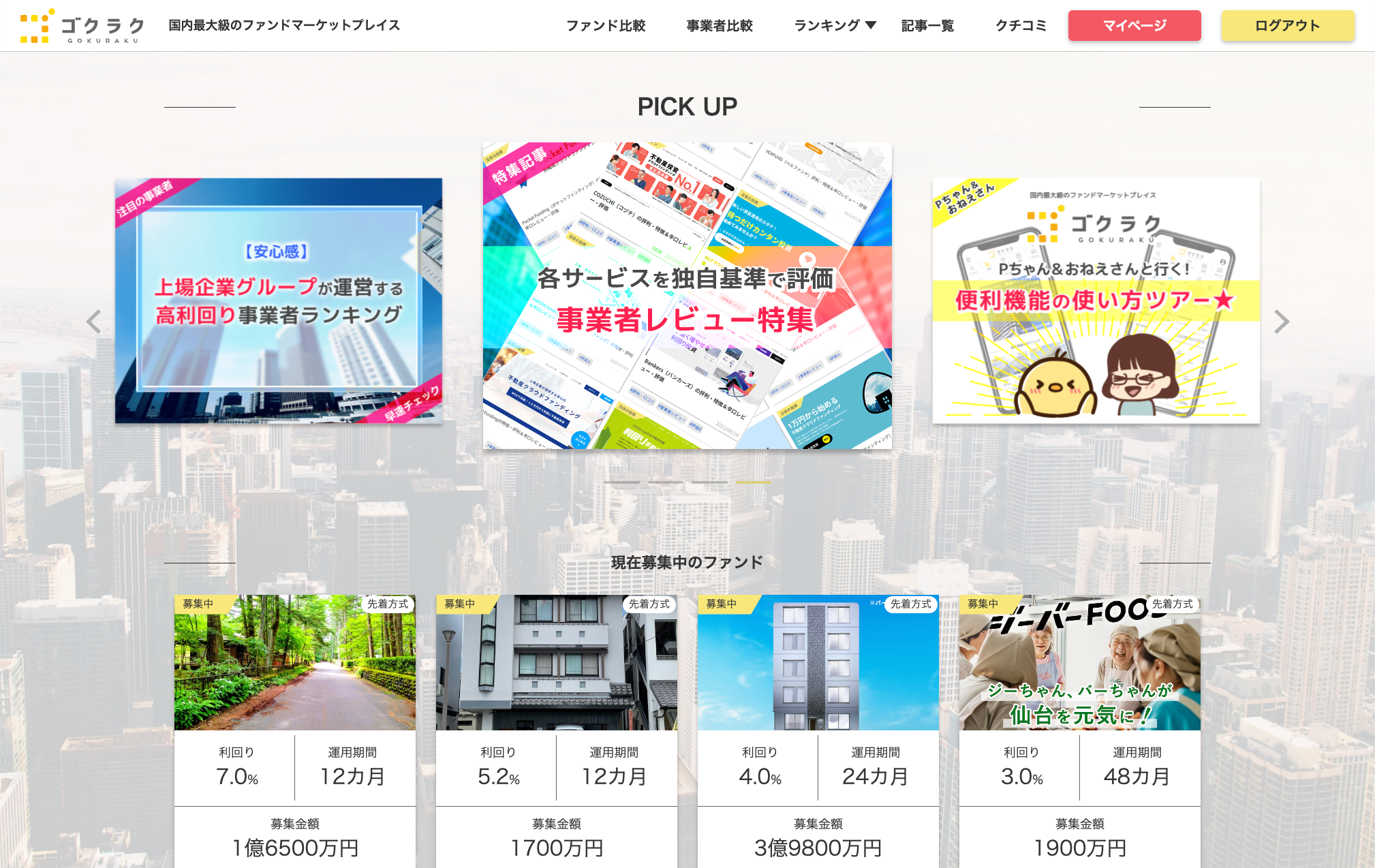 「ゴクラク」はこのような課題に対する最適なソリューションを目指して誕生したサービスです。投資初心者からベテランまで、不動産クラウドファンディングやソーシャルレンディングへの投資を検討するすべての人が、かんたん・直感的にサービス事業者・ファンドを比較・検索できる、新しい投資プラットフォームです。