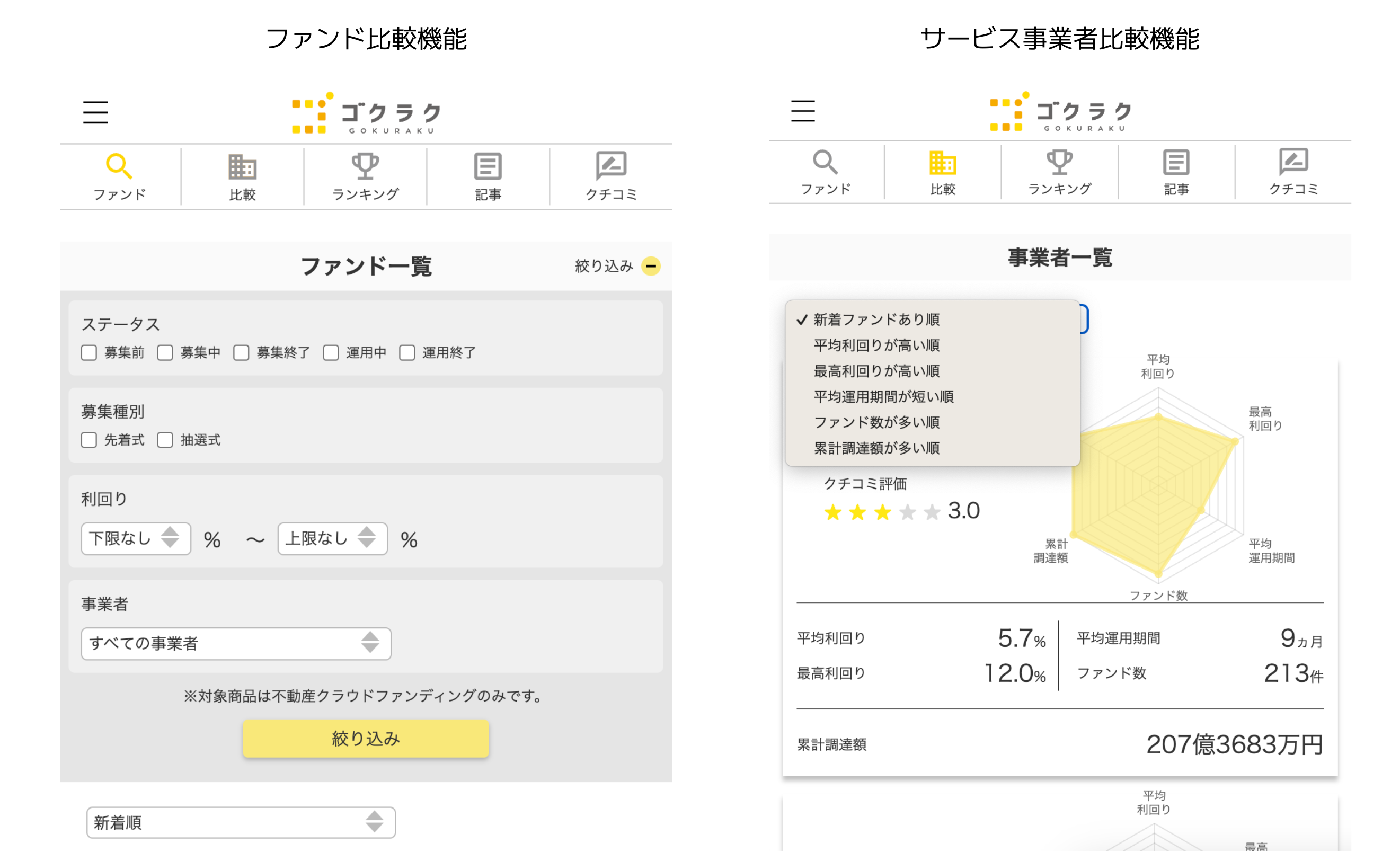「ゴクラク」では、投資家それぞれの投資スタイルに適したサービス事業者・ファンドをスムーズに見つけていただけるよう、さまざまな比較・検討機能を用意しています。