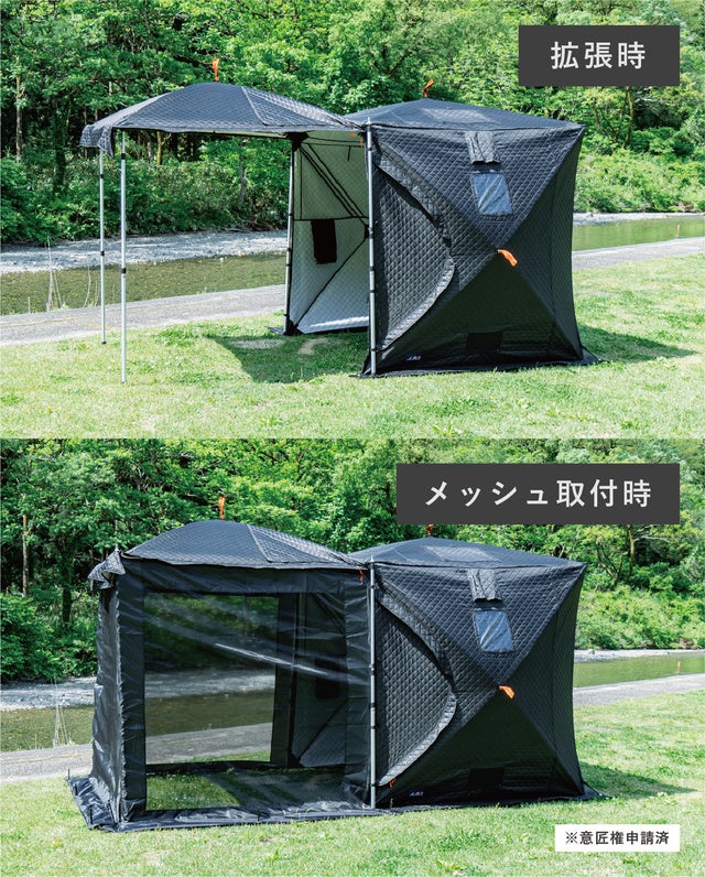 さらに付属の蚊帳を取り付ければ、広々とした奥行きのあるテントに。グランドシートを敷いたり、コット(アウトドアベッド)を置くことで、そのまま宿泊も可能です。・プロジェクトページ:https://www.makuake.com/project/abil/