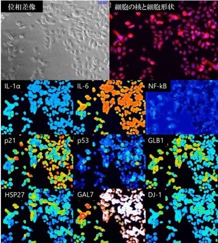 位相差像(左上)と細胞の核と細胞形状の蛍光像(右上)、およびAIによる分化(Hsp27, GAL7)、炎症(Interleukin-1α (IL-1α), IL-6, NFkB)、老化(p21, p53, β-galactosidase (GLB1))、抗酸化(DJ-1)の指標となる各タンパク質の推定像。