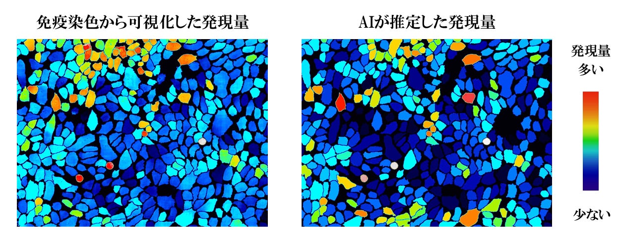 図1 免疫染色像とAIが推定した細胞内のタンパク質発現量の比較
