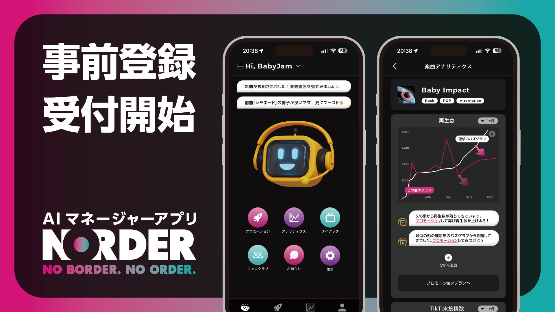 音楽アーティストのためのマネージャーアプリ「NORDER」を運営する株式会社BabyJam(本社所在地:山口県下関市 / 東京オフィス:東京都目黒区 / 代表:田村亮二)は、これまでのアプリを刷新し、AIマネージャーアプリとして生まれ変わることを発表し、同時に事前登録の受付を開始しました。