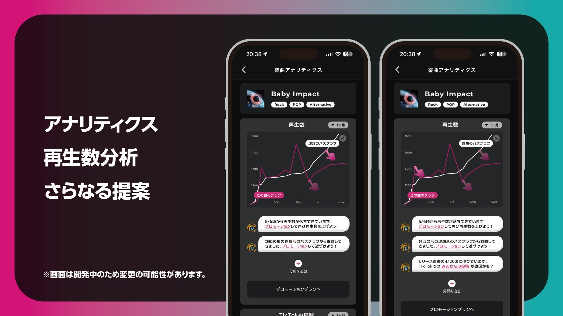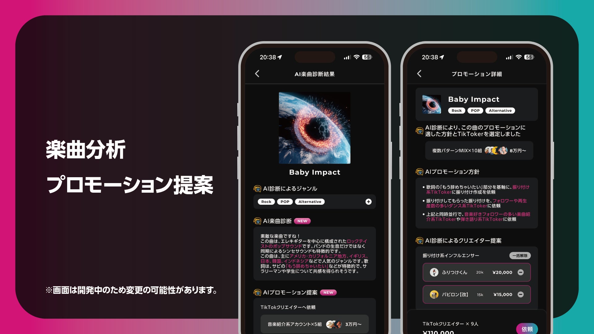 BabyJamは、これまでも音楽プロモーション会社としてメジャーレーベルや大手事務所の音楽アーティストのプロモーションをしてきました。これまでに実施してきた数々のプロモーション実績によって蓄積されたノウハウを、今後はAIを活用することでインディペンデントで活動する音楽アーティストにも提供することでBabyJamの「すべてのアーティストの未来を作る」というビジョンの実現に向けて邁進して参ります。