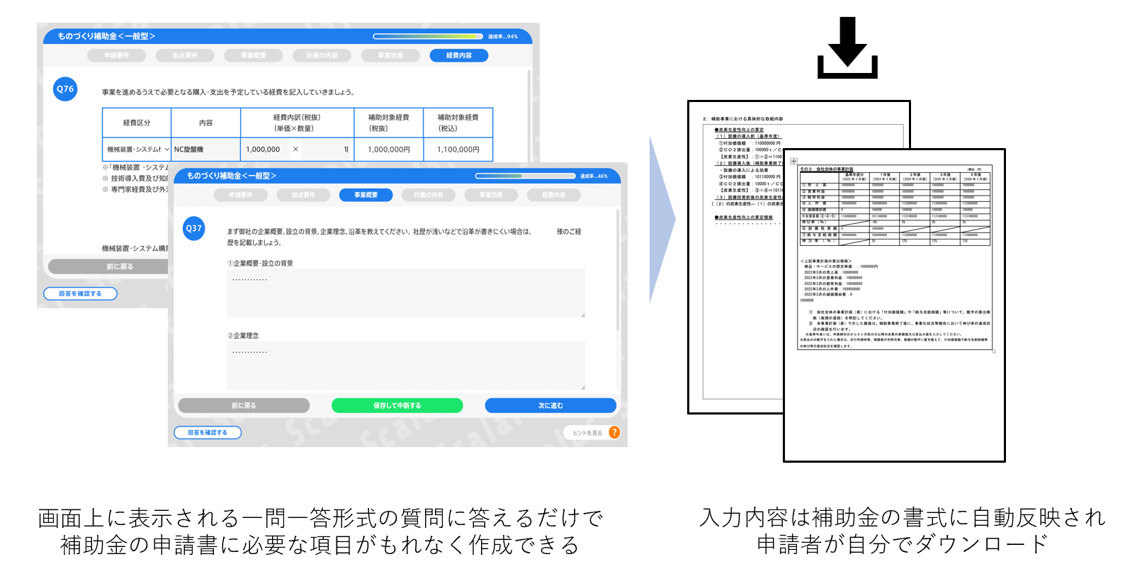 「ScalarSelf(スカラーセルフ)」では、画面上に表示される一問一答形式の質問に答えるだけで補助金の申請書に必要な項目が作成でき、申請にそのまま利用できる書式一式をダウンロードできるクラウドサービスです。