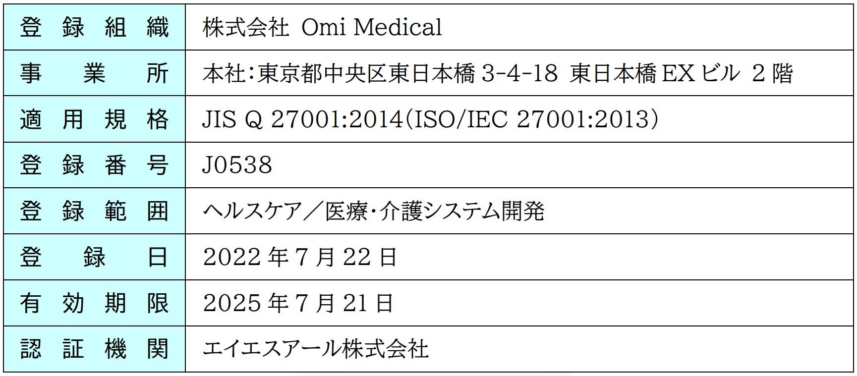 株式会社Omi Medical (本社:東京都中央区、代表取締役:ダン・ミ・ハイン、以下「Omi Medical」) は、情報セキュリティマネジメントシステム(ISMS)認証基準の国際規格「ISO 27001」の認証を全社範囲にて取得いたしました。