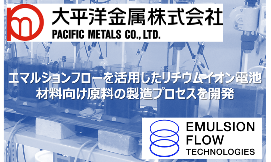 株式会社エマルションフローテクノロジーズ(本社所在地:茨城県那珂郡東海村、代表取締役:鈴木裕士、以下EFT)は、大平洋金属株式会社(本店所在地:東京都千代田区、代表取締役:青山正幸、以下大平洋金属)と共同で、エマルションフロー技術を活用したリチウムイオン電池材料向けの原料の製造プロセス開発に着手し、コスト面を含めて商業生産にも十分適用できる実用レベルの溶媒抽出プロセスの開発に成功しました。
