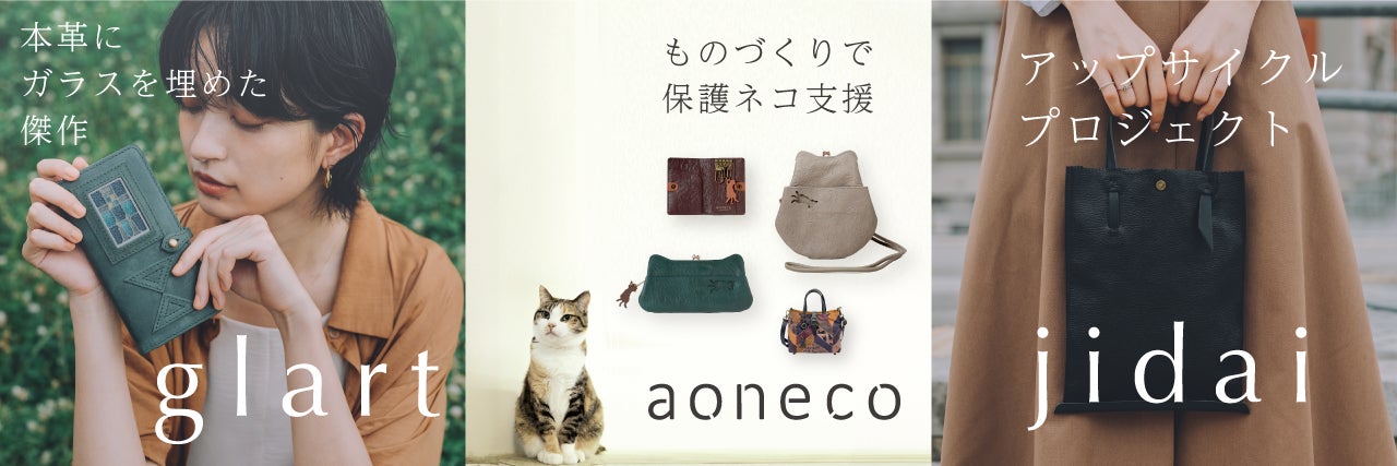 2016年創業。デザイン、型作成、素材調達など自社製造機能を持つ『プロのものづくり集団』として本革にガラスを埋め込んだ革小物『glart(グラート)』や、ものづくりで保護ネコを支援するプロジェクト『aoneco(アオネコ)』などのブランドを手がけています。2023年には大阪府堺市とSDGs実現に向けた『jidai(ジダイ)プロジェクト』を開始。堺市やタカラベルモント株式会社などの様々なパートナーとともに、役目を終えた資材を用いた商品開発を行い、新たな価値の創造に挑戦しています。